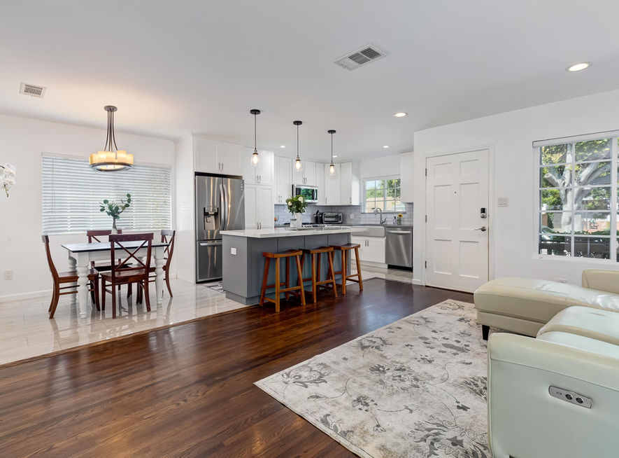 Welcome to this gorgeous remodeled home located in the highly sought after Sunkist Park neighborhood of Culver City. The 3-bedroom, 2-bathroom home was completely remodeled in 2018 with many upgrades, including a newly constructed master suite addition with separate laundry room (approx. 500 sq.ft.). This turnkey home boasts an open floor plan concept for living room, dining area, and kitchen, great for entertaining! The remodeled kitchen features a large center island with quartz counter tops, pendant lighting, shaker cabinets, backsplash, tile flooring, and stainless-steel appliances. The spacious master bedroom has recessed lighting and a large walk-in closet. The master bathroom offers a new vanity with quartz countertops, dual sinks, shaker cabinets, and an extra deep jetted spa bathtub with a seamless glass enclosure. Newly installed upgrades include: central heating and air conditioning; all new double-pane windows and sliding glass doors; a new electrical panel; and a new roof. All lighting in home, garage, and exterior was upgraded to LED high efficiency. Brand new solar panels on roof with Wi-Fi/app monitoring, with most light switches being smart home capable. Living room, hallway and one of the bedrooms feature original hardwood floors that have been newly refinished. Two-car garage features extra high ceiling with Wi-Fi capable garage door opener. Front yard has drought tolerant plants and underground programmable water distribution system while the private backyard has a programmable water sprinkler system. Hurry before it's gone!